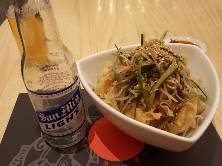 実は、ギョウザの皮を揚げたような感じのものが下に敷き詰められていて、実際の野菜部分(モヤシナムル?)はそれほど多くありません。